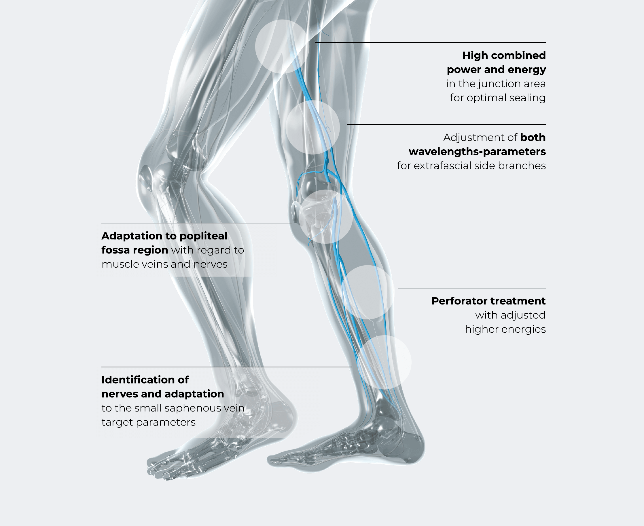 The energy delivery can be adapted to each vein’s diameter, wall thickness, and proximity to nerves or other sensitive structures, allowing controlled thermal confinement. This dual-wavelength approach effectively limits lateral heat diffusion into surrounding tissue, thereby further reducing pain, hematomas, and nerve irritation.